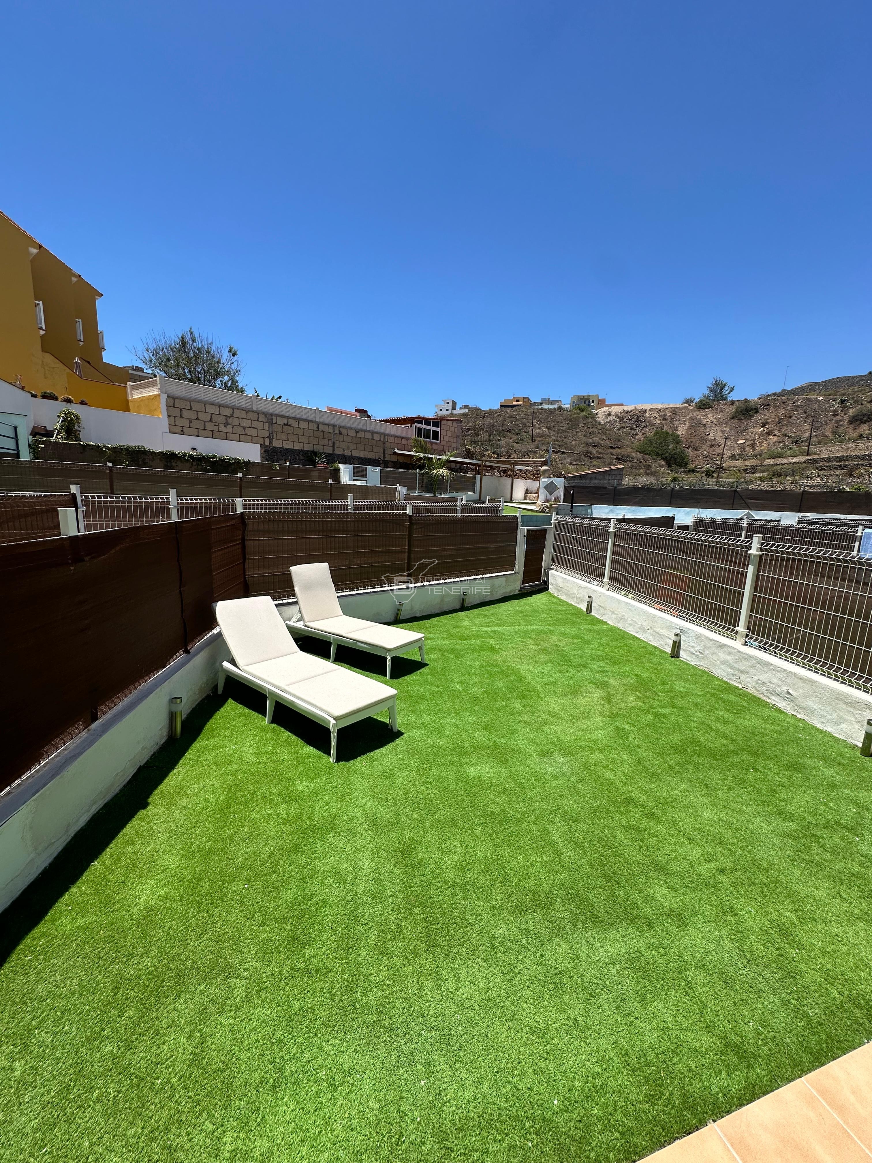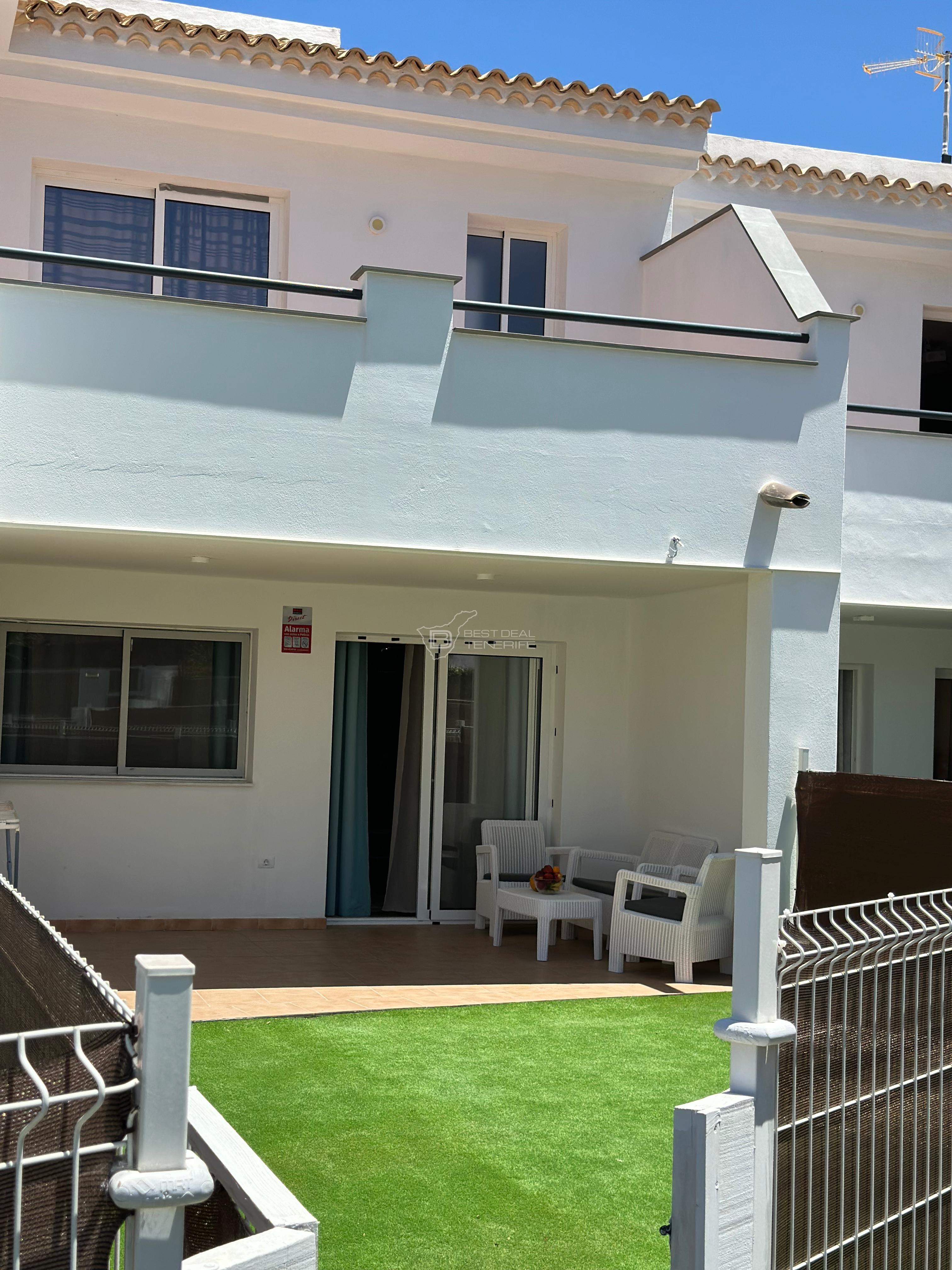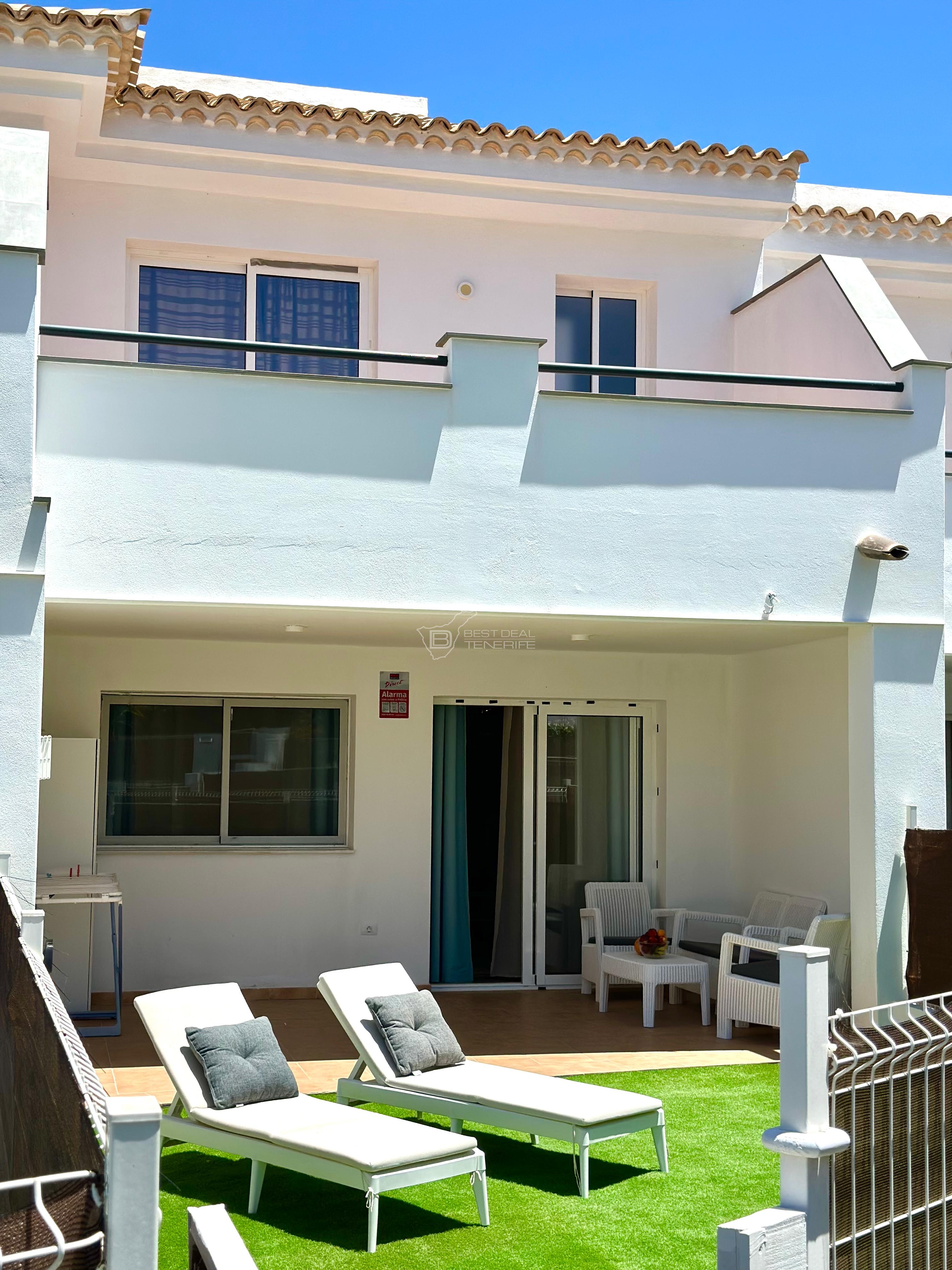 This semi-detached house offers spacious and well-lit spaces. It has 3 bedrooms, 3 bathrooms, separate kitchen, a large living room, two terraces, a garden and access to the communal pool. The whole house is equipped with new appliances and fully furnished.