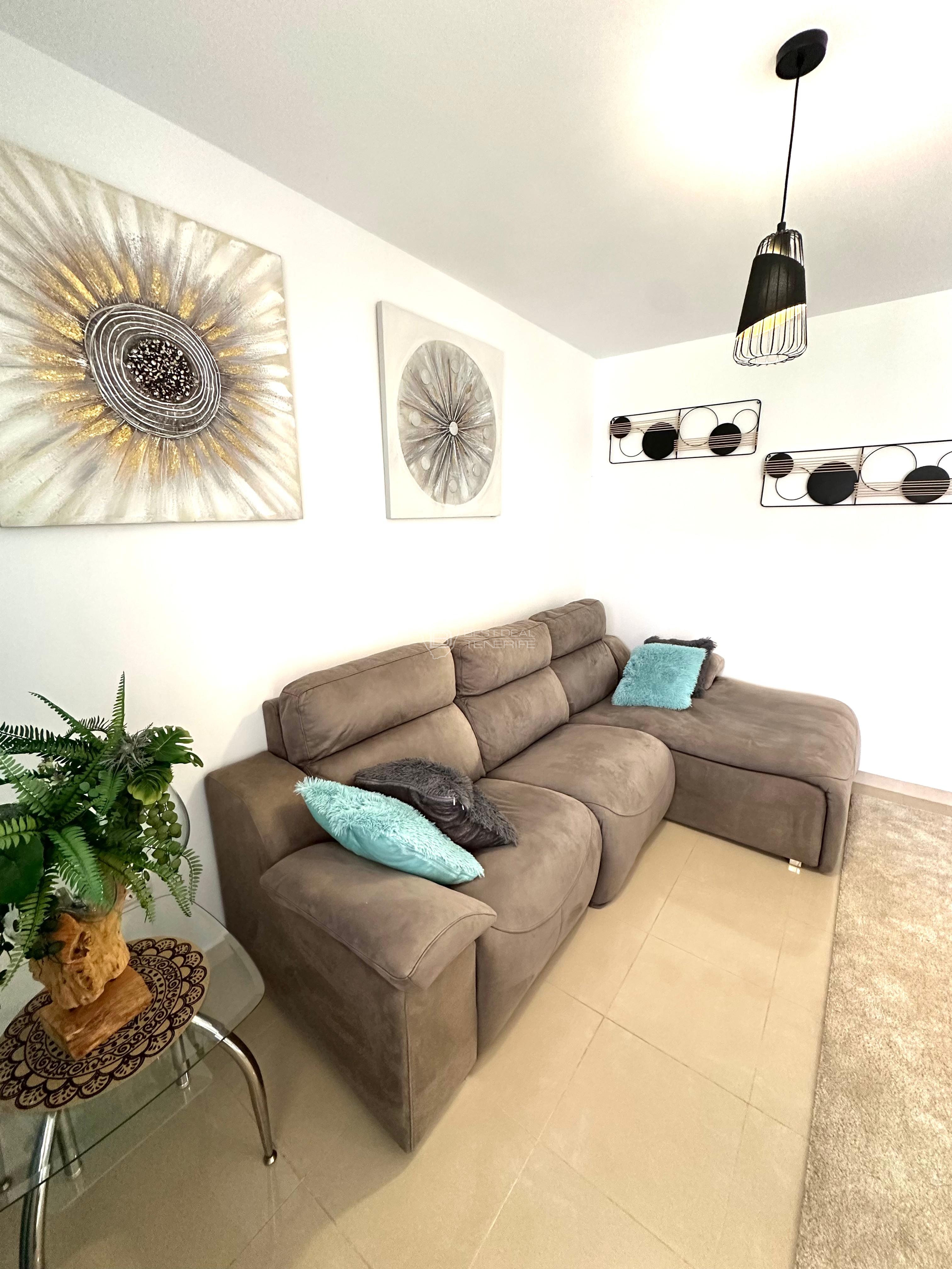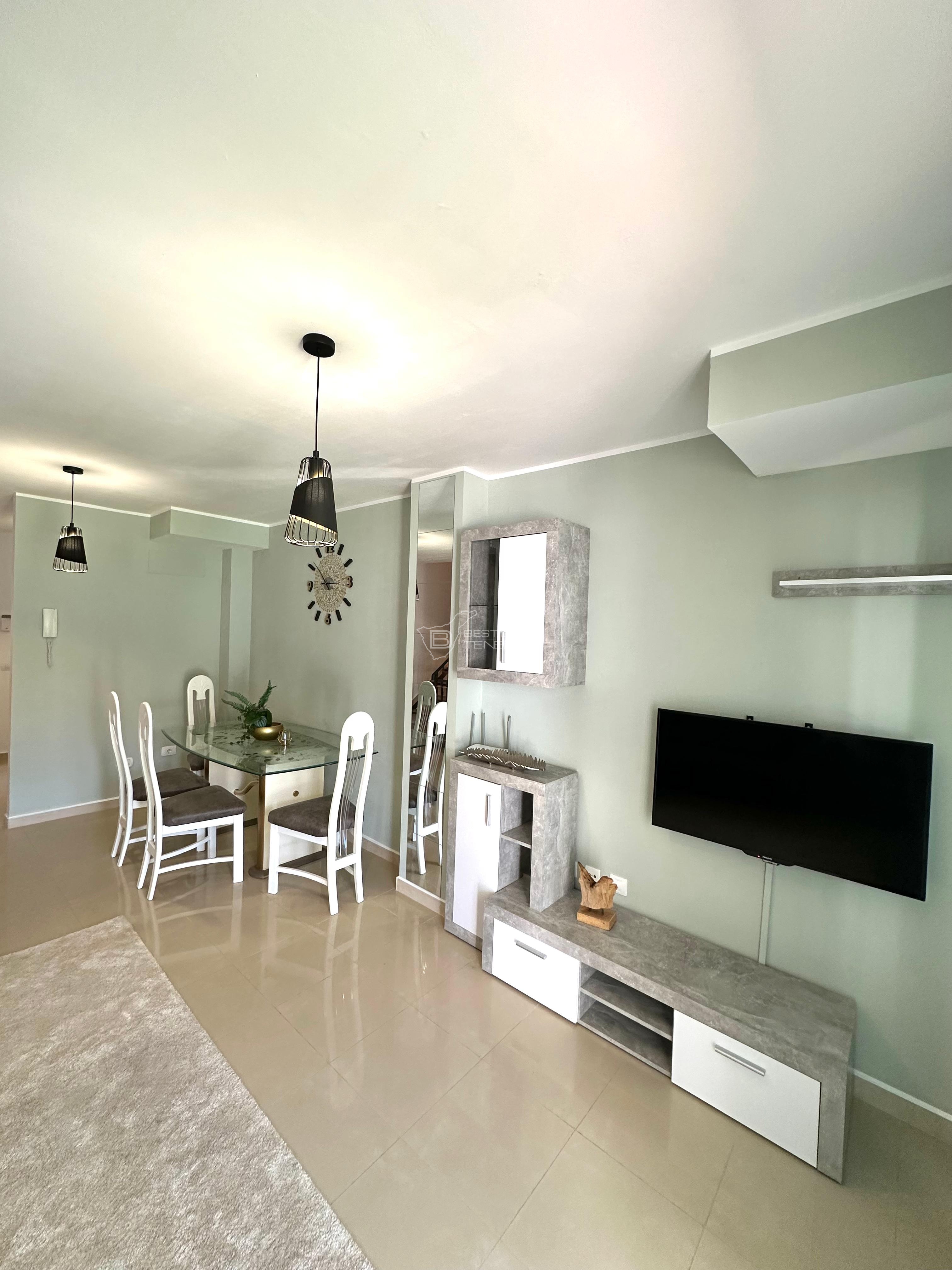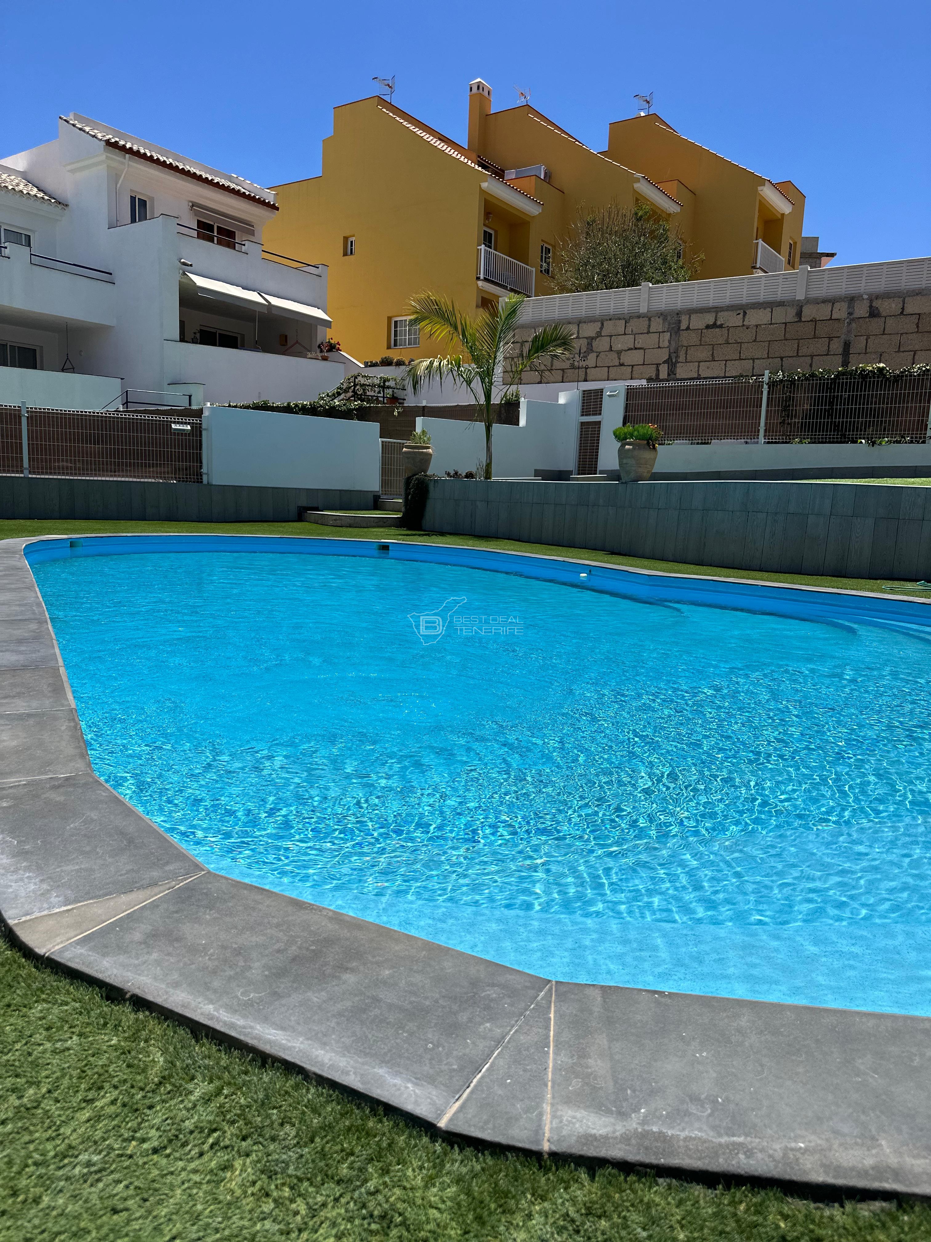 This semi-detached house offers spacious and well-lit spaces. It has 3 bedrooms, 3 bathrooms, separate kitchen, a large living room, two terraces, a garden and access to the communal pool. The whole house is equipped with new appliances and fully furnished.