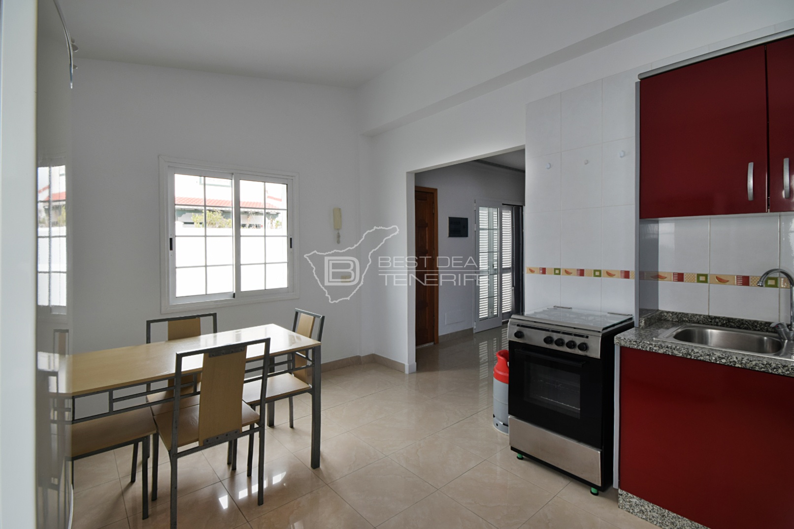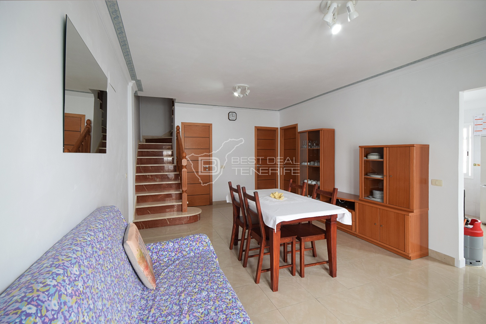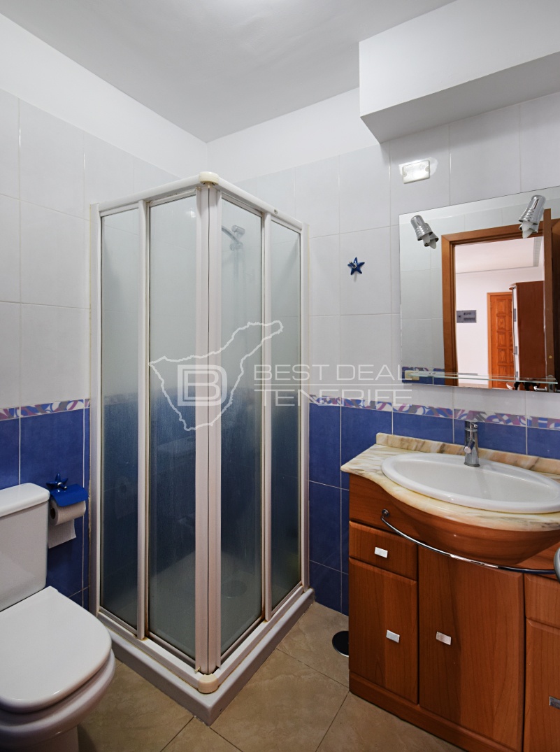 On the ground floor there is a spacious living room, a fully equipped bathroom, a bedroom and a separate kitchen with a dining area.